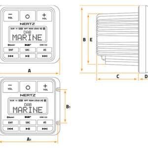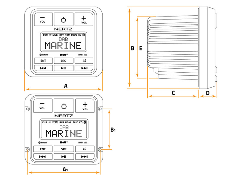 DESIGN TRENDY A BORDO La nuova sorgente Hertz presenta un design minimalista a forma quadrata, perfettamente in linea con le ultime tendenze degli strumenti di navigazione più prestigiosi. Il fulcro è un ampio display con il grande pannello a pulsanti marine-grade distribuito simmetricamente nella parte inferiore e superiore. Grazie al Bluetooth® 5.0 è possibile trasmettere audio di alta qualità dal tuo dispositivo mobile preferito, massimizzando il divertimento in mare aperto! HMR 15 D offre la compatibilità DAB+ per ascoltare le tue stazioni radio preferite con prestazioni audio impareggiabili. Technical Specs Display 2.8” DOT Matrix display Peak Power @ 4 4 x 50 W Front panel IP rating IP66 Line Out 2 x L + R (FRONT + REAR) Subwoofer Out 1 x L+R (LPF: 80, 120,160 Hz) Aux Input (RCA) 1 x L + R Eq. Preset 3 PRESET Bluetooth 5.0 Audio streaming Remote Control HMC U1 (up to 3) Foro di montaggio mm 89.5 (3.52) Profondità di montaggio mm 72 (2.83)