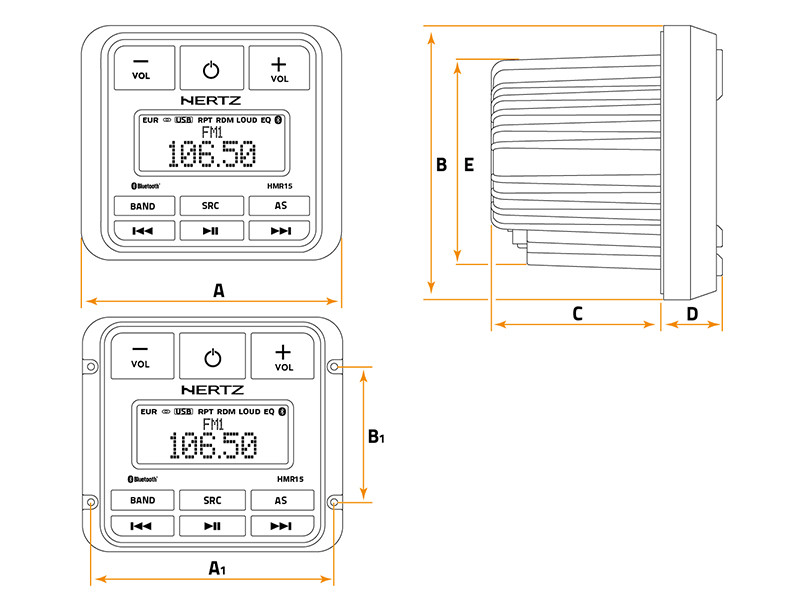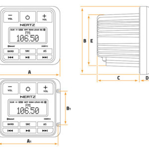 Hertz HMR 15 nuova sorgente nautica Hertz, presenta un design squadrato minimalista, perfettamente in linea con le ultime tendenze degli strumenti di navigazione più prestigiosi. Uno dei punti di forza è il generoso display con la grande pulsantiera marina distribuita simmetricamente nella parte inferiore e superiore. Grazie a Bluetooth 5.0 puoi trasmettere in streaming audio di alta qualità dal tuo dispositivo mobile preferito. Caratteristiche principali: • HMR 15 D è dotato di grado di protezione IP66, standard ASTM-D4329 per la resistenza ai raggi UV e ASTM-B117 per l’operatività in nebbia salina e una lunga durata, stagione dopo stagione. • 3 preset EQ creati dall’ingegnere audio Hertz • Design minimalista • Ampio display e grandi pulsanti • Bluetooth 5.0 per streaming wireless di qualità Technical Specs Display 2.8” DOT Matrix display Peak Power @ 4 4 x 50 W Front panel IP rating IP66 Line Out 2 x L + R (FRONT + REAR) Subwoofer Out 1 x L+R (LPF: 80, 120,160 Hz) Aux Input (RCA) 1 x L + R Eq. Preset 3 PRESET Bluetooth 5.0 Audio streaming Remote Control HMC U1 (up to 3) Foro di montaggio mm 89.5 (3.52) Profondità di montaggio mm 72 (2.83)