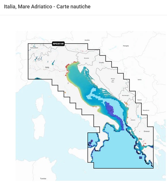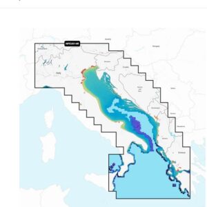 Cartografia Navionics Platinum con copertura del fiume Po e della costa adriatica di Italia, Slovenia, Croazia, Albania, della costa occidentale della Grecia e dell’Italia meridionale. La copertura comprende la Sicilia orientale, lo Stretto di Messina, la costa dalmata, il Golfo di Taranto, il Lago Maggiore, il Lago d’Iseo, il Lago di Como e il Lago di Garda.