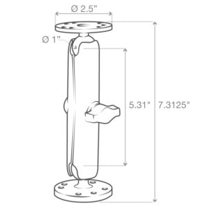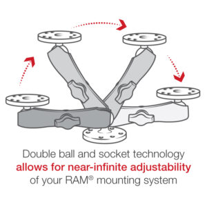 The RAM-B-101U consists of a long length B size 1″ double socket arm and two 2.5″ diameter round ball bases that contain the universal AMPS hole pattern. The ball and socket system provides shock and vibration damping, and allows for near-infinite adjustability to achieve an ideal viewing and operating angle of your device.