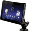Il KIT è costituito da un componente piano che si avvita su qualsiasi superficie piana ed è in metallo. Il cradle in plastica dura molto resistente ed è disegnato in modo da avvolgere il TABLE PC non solo per dalle vibrazioni e dal movimento ma sopratutto per non ostruire le porte di collegamento del tablet pc quali l’ingresso caricabatterie