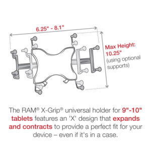 The RAM-B-101-C-UN9U consists of a long length B size 1″ double socket arm and two 2.5″ diameter round ball bases that contain the universal AMPS hole pattern, as well as the RAM X-Grip universal holder for 9″-10″ tablets. The RAM X-Grip features an ‘X’ design that expands and contracts to provide a perfect fit for your device even if it’s in a case. Included are easy access grip knobs located on the back of the cradle for quick release of your tablet. RAM ball and socket technology allows for near-infinite adjustability to achieve the ideal viewing angle while also extending the life of your phone by providing shock and vibration damping. This version of the RAM X-Grip holder is compatible with tablets that will fit the dimensions listed below. It is important to verify the dimensions of device with its case, sleeve, or skin when determining the overall size.